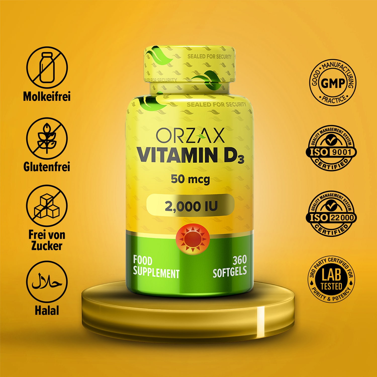 Orzax Vitamin D3 liefert 2.000 I.E. pro Softgel – in Form von Cholecalciferol, der bioverfügbarsten Form von Vitamin D. Ideal für Personen, die wenig Sonnenlicht ausgesetzt sind.